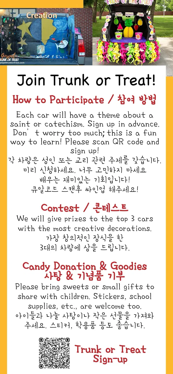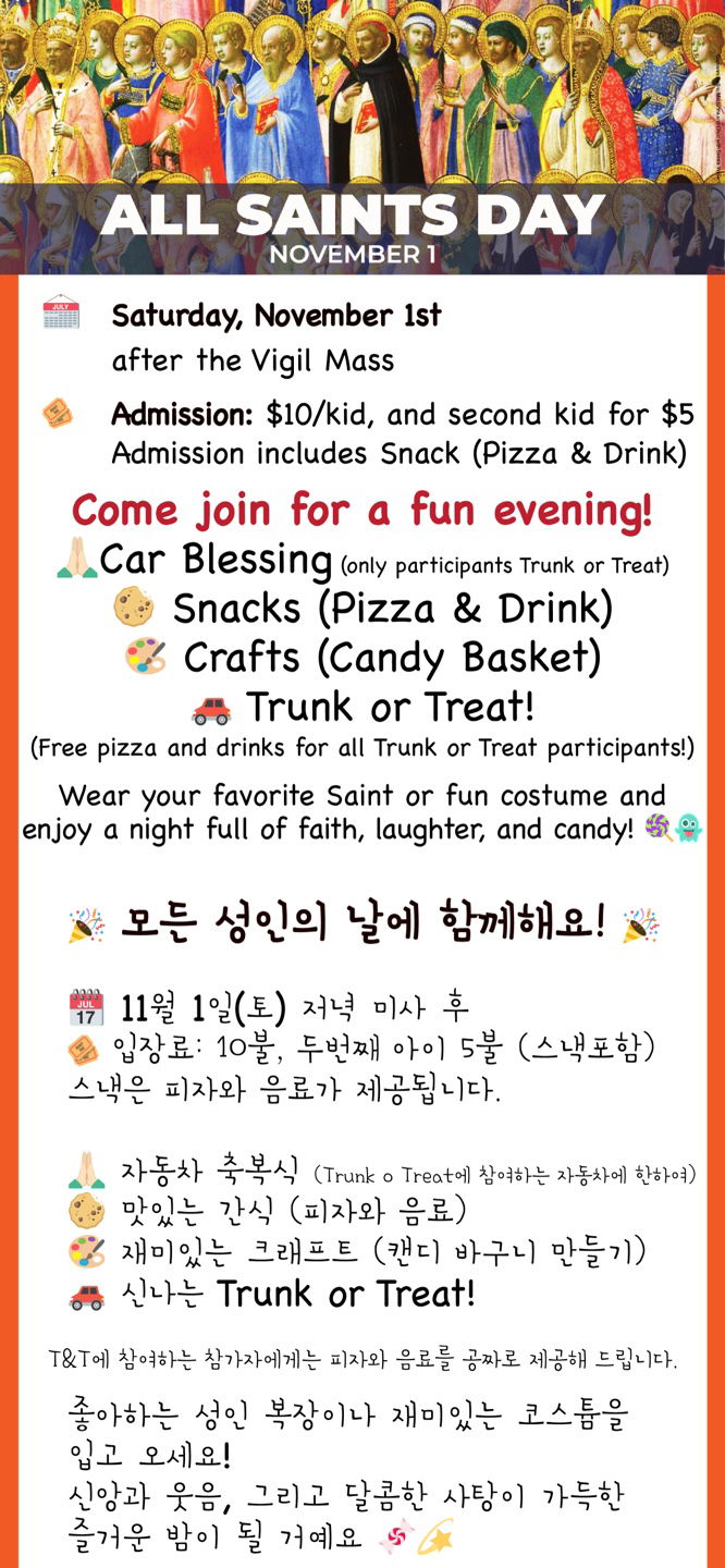 Come join for a fun evening! ✦ November 1st, after the Vigil Mass ✦ Admission: $10/kid, and second kid for $5 ✦ Car Blessing (only participants Trunk or Treat) ✦ Snacks (Pizza & Drink) ✦ Crafts (Candy Basket) ✦ Trunk or Treat! ✦ 모든 성인의 날에 함께해요! ✦ 11월 1일(토) 저녁 5:30 특전미사 후 ✦ 입장료: 10불, 두번째 아이 5불 (피자와 음료 포함) ✦ 자동차 축복식 (Trunk o Treat에 참여하는 자동차) ✦ 재미있는 크래프트 (캔디 바구니 만들기) ✦ 신나는 Trunk or Treat!