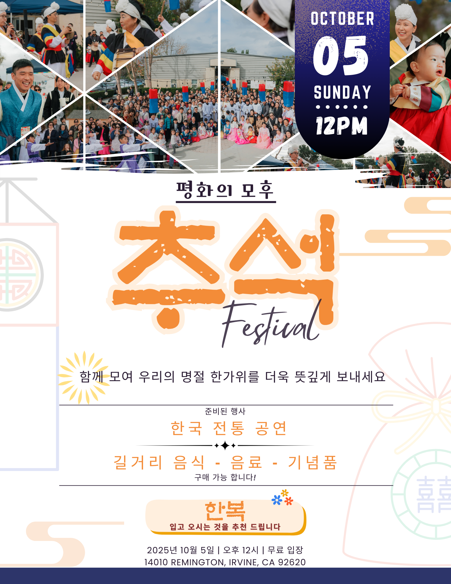 Come celebrate Korean Thanksgiving with us! Masses: 9:00 AM & 11:00 AM (Bazaar begins after the 9:00 AM Mass), Food and beverage sales by SFCs/Ministries, Legion of Mary items for sale, Performances (12:30 PM)- Taekwondo, Samulnori (traditional percussion), Fan Dance